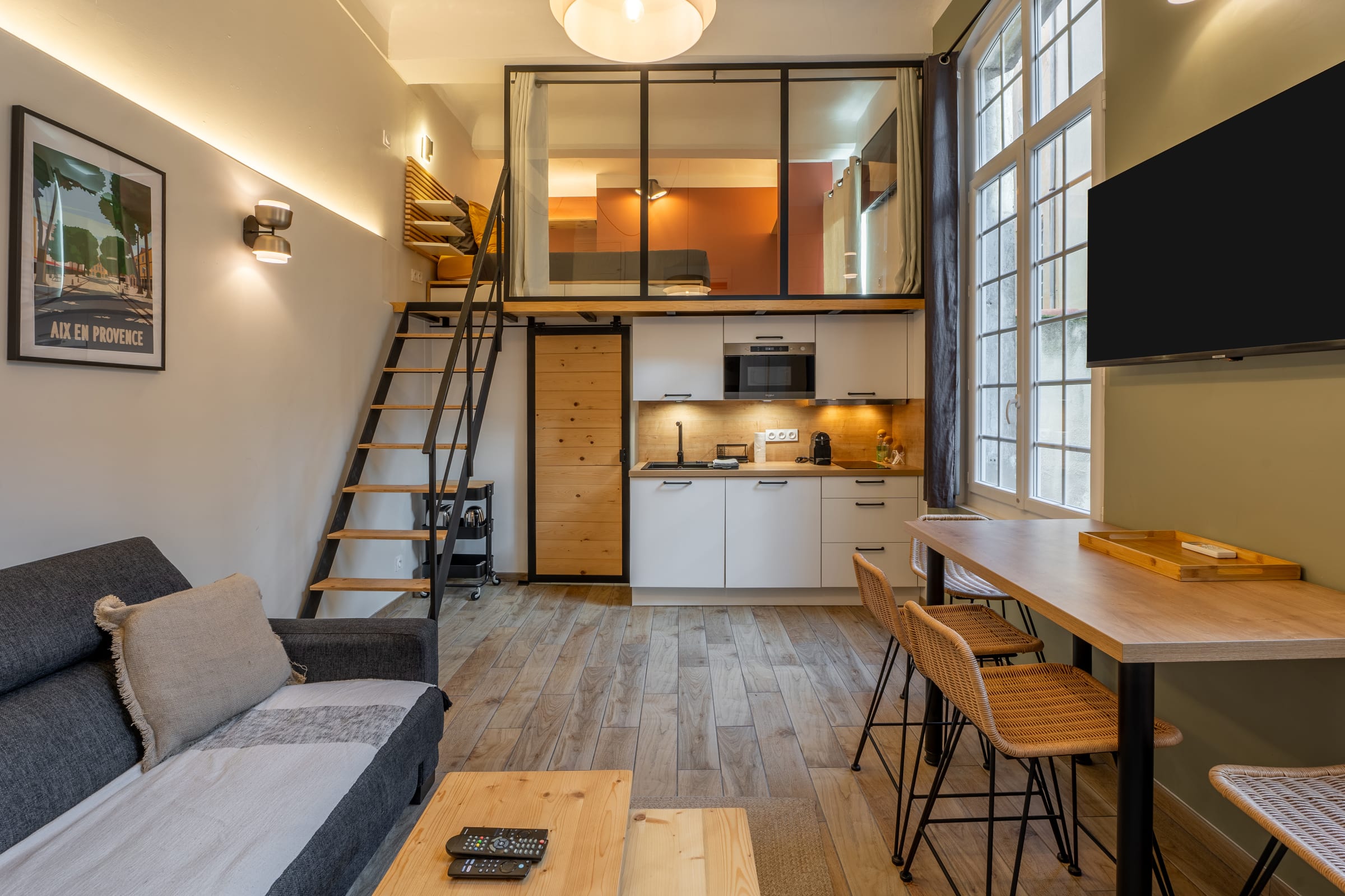 Welcome to this furnished class apartment of Tourisme 3 stars, completely renovated in the heart of the historic center of Aix-en-Provence! Ideal for a romantic stay for two, this apartment with mezzanine is located on the 1st floor of a 4-storey building without elevator.