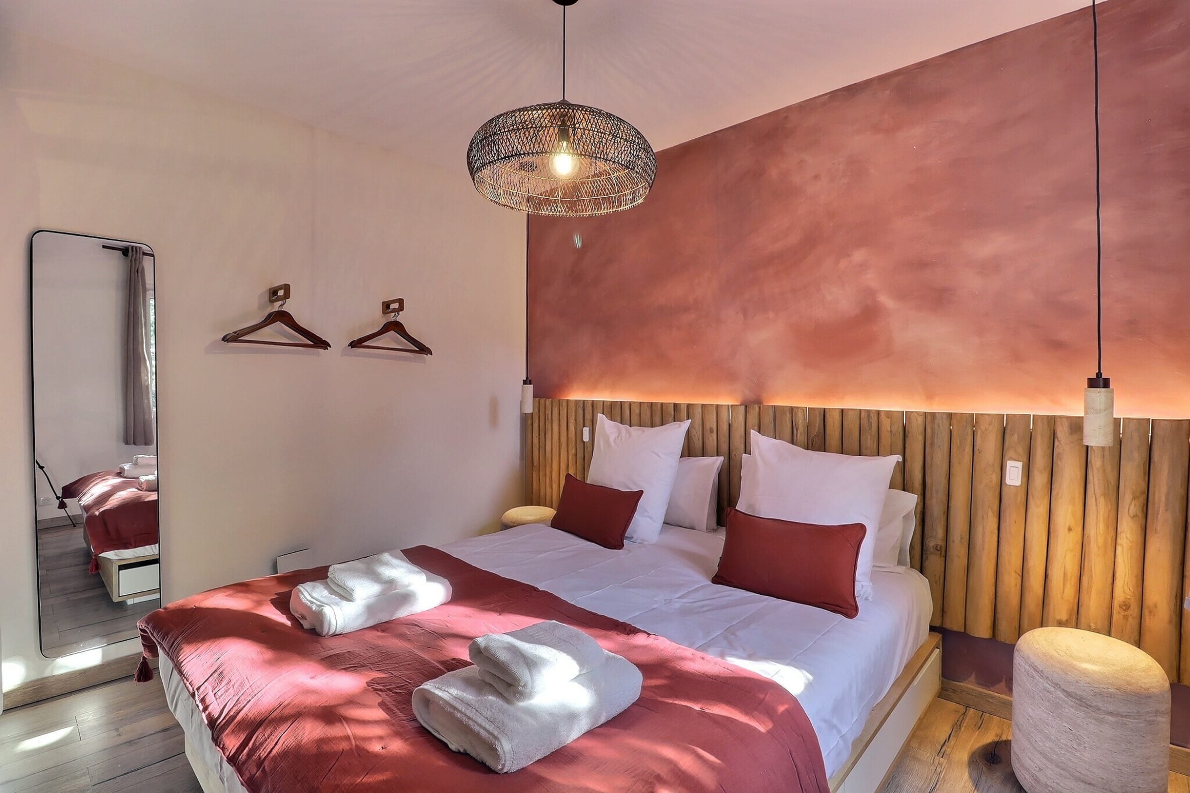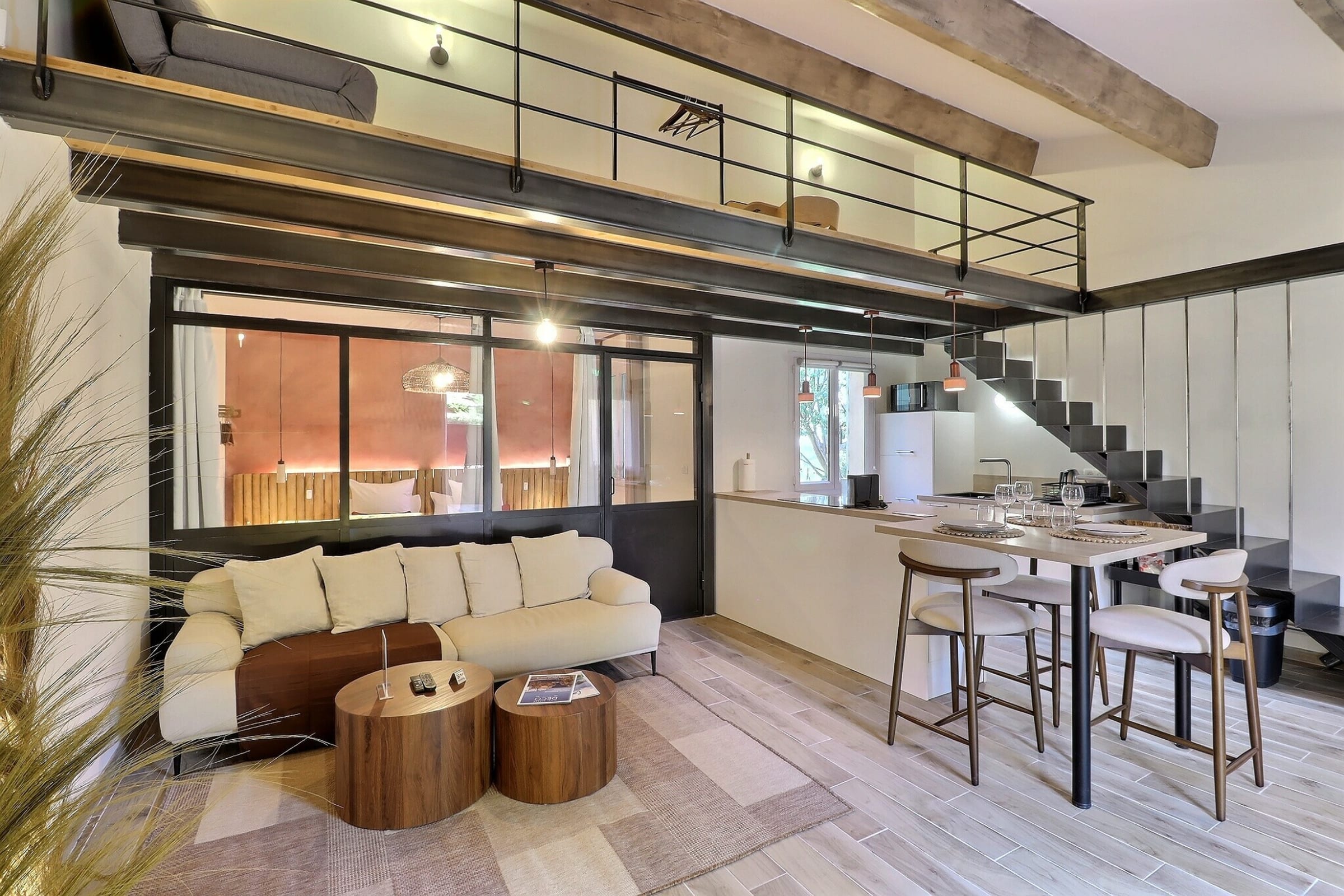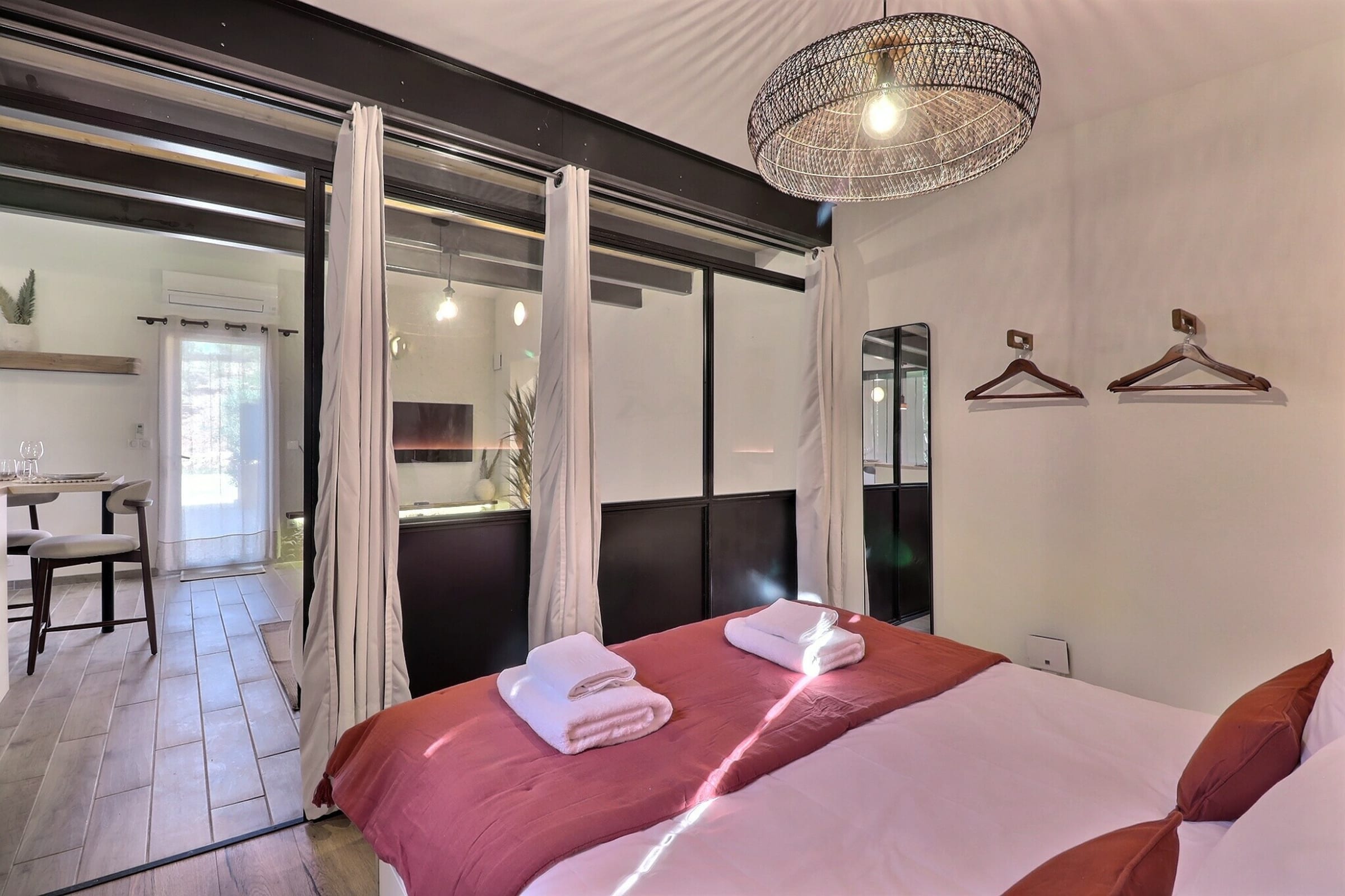 From the moment you step inside, the tone is set. The decor is both modern and refined, showcasing beautiful raw materials and a soothing ambiance, ideal for unwinding as a couple or simply enjoying a timeless break. The living area features a comfortable sofa and a smart TV, perfect for cozy evenings after a day spent exploring the region.