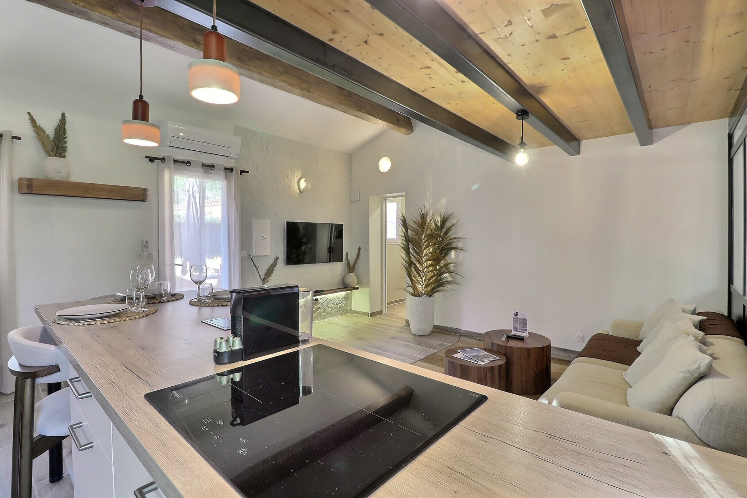 The open-plan kitchen is practical and well equipped, allowing you to enjoy your stay at your own pace. It includes a 3-burner ceramic hob, oven, microwave, coffee machine, large fridge-freezer, and all the crockery and kitchen essentials needed for your meals.