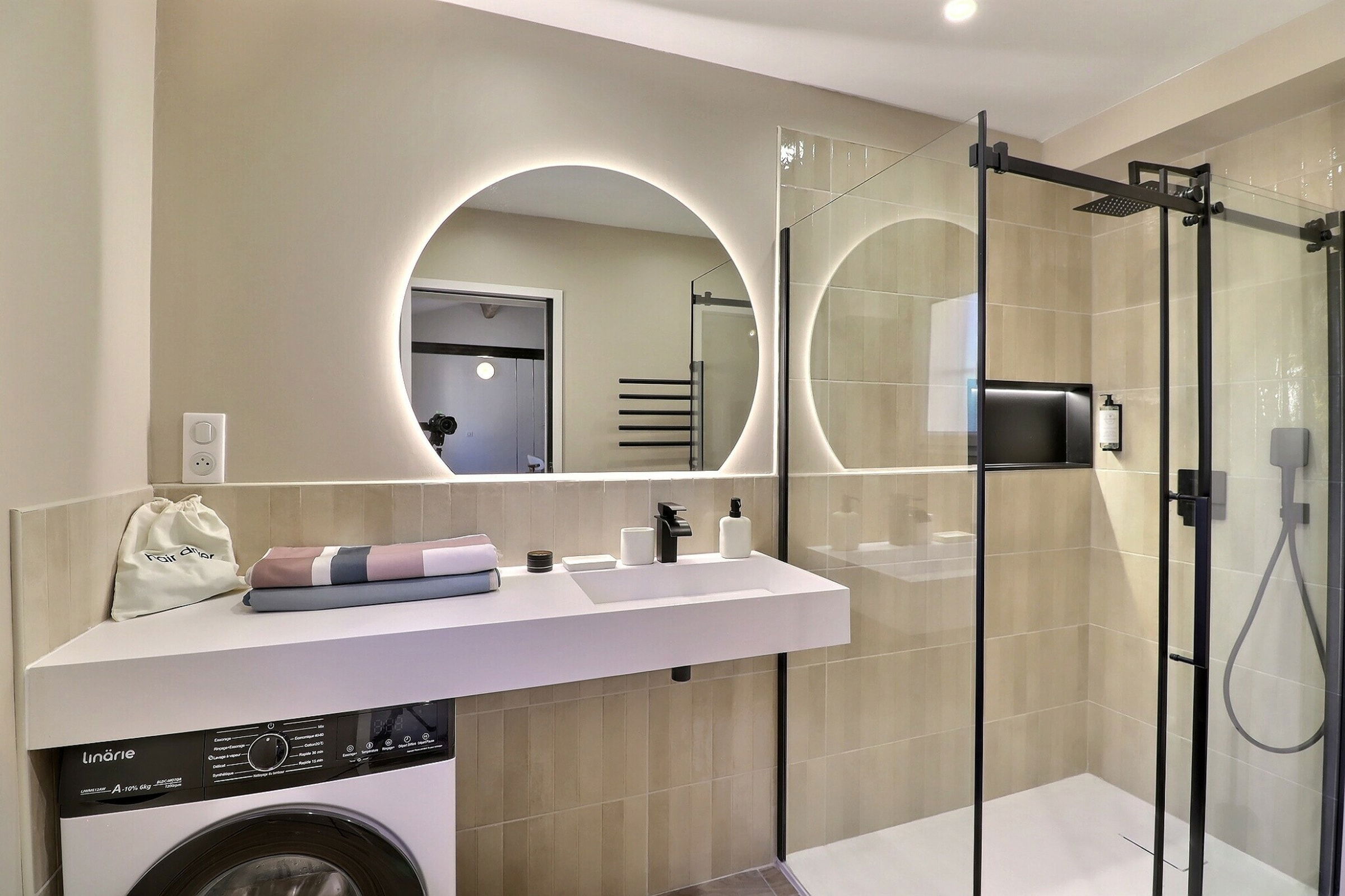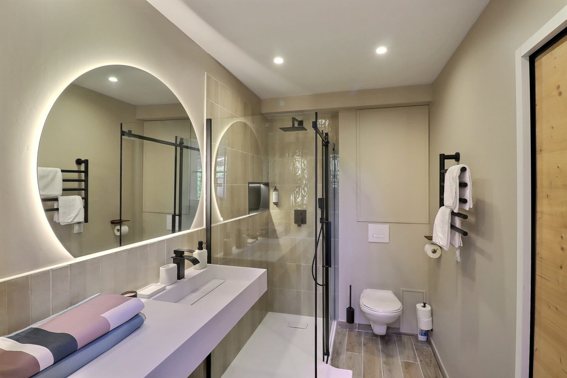 The bathroom stands out for its understated and contemporary elegance. It features a walk-in shower, wall-hung toilet, heated towel rail, as well as towels and bathrobes provided for your comfort.