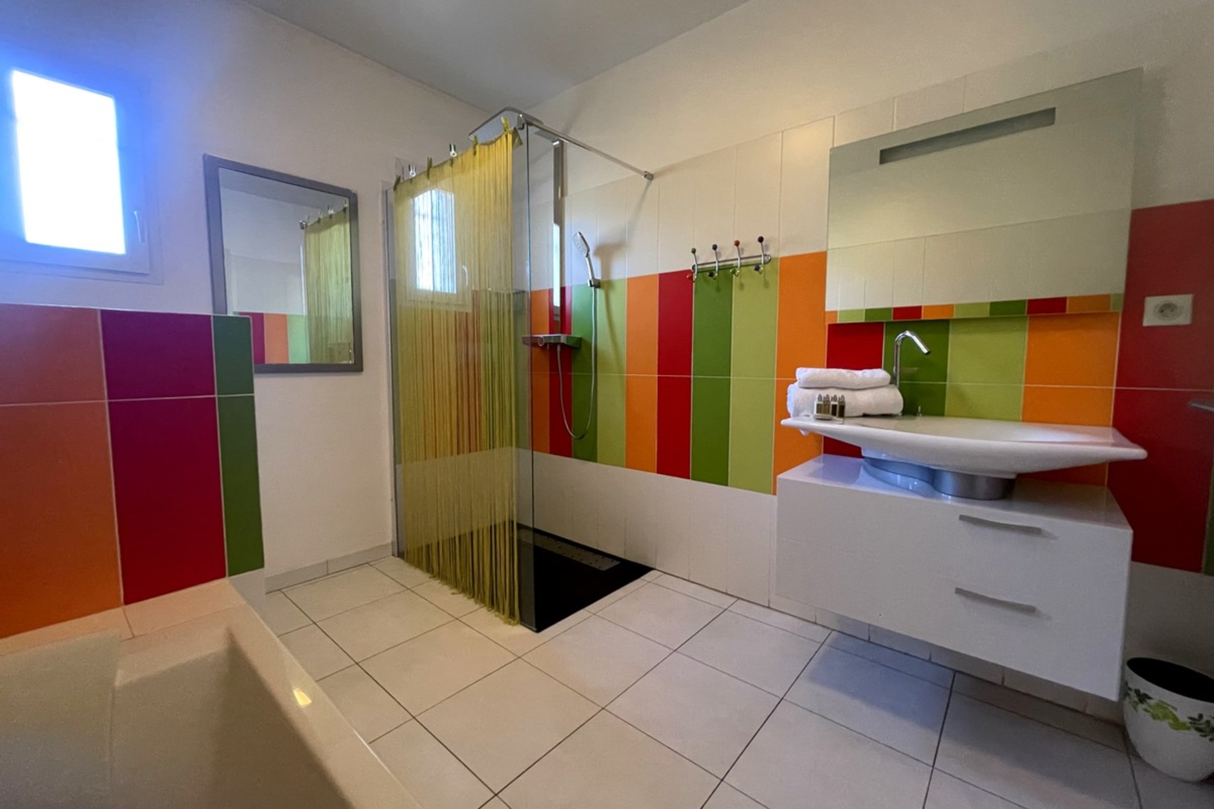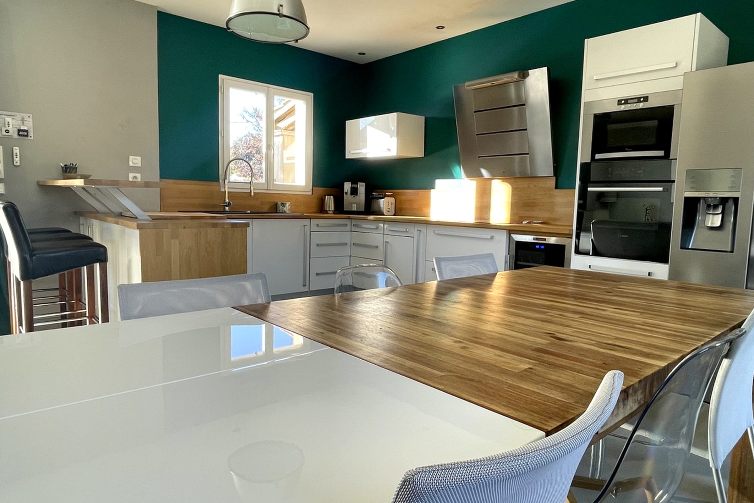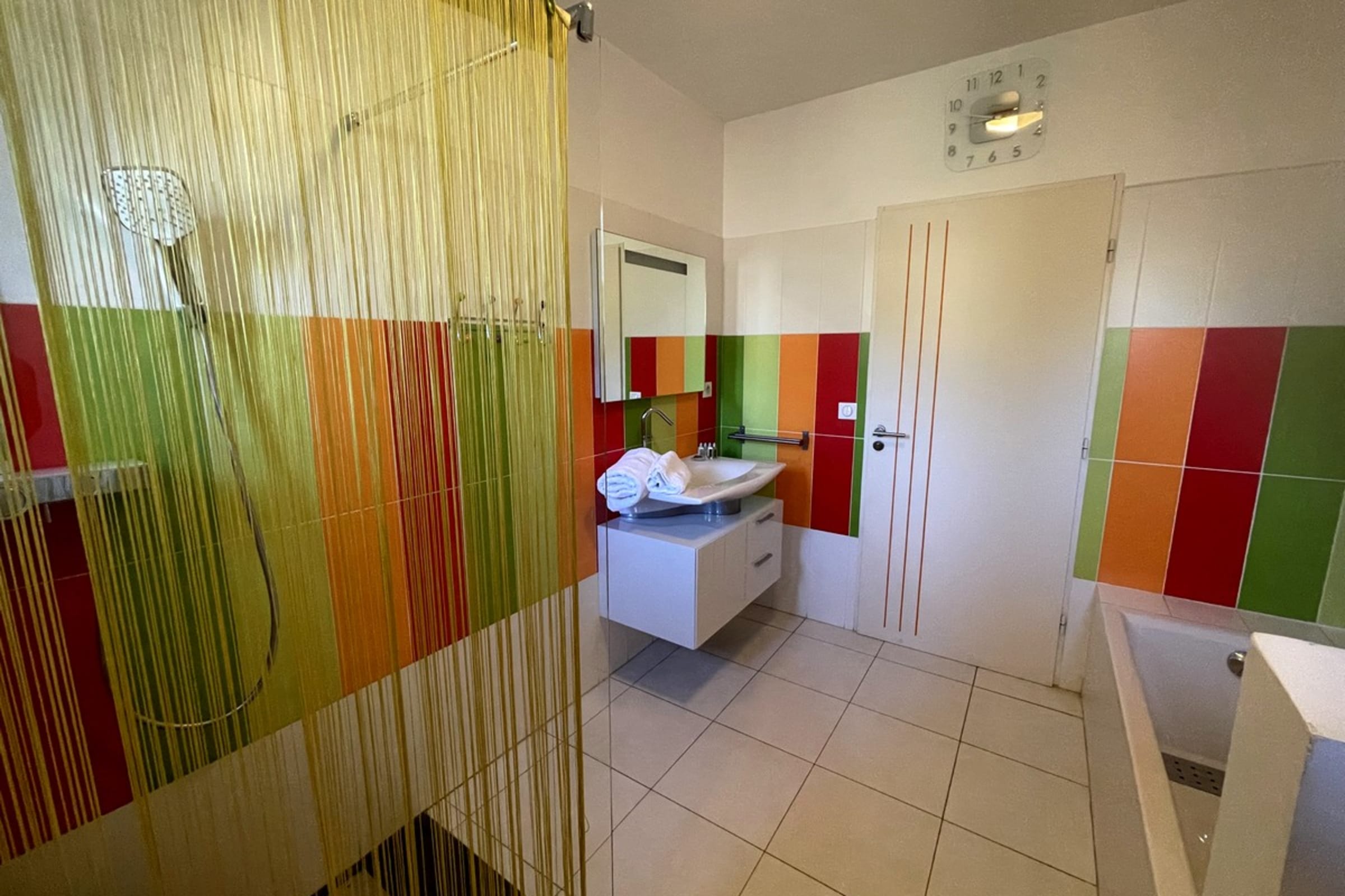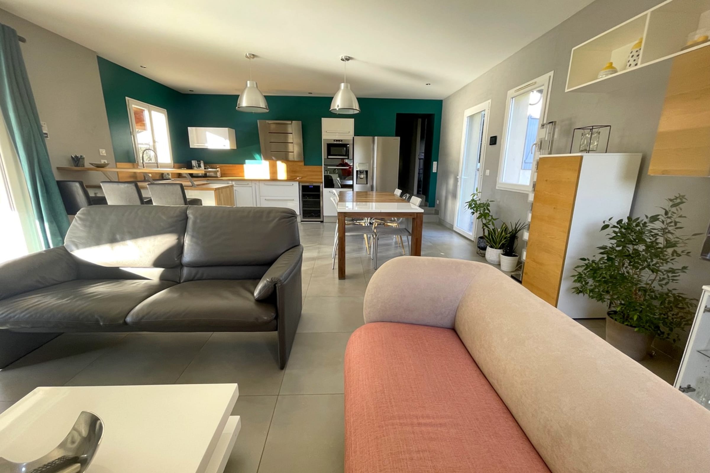 With its large living room opening onto the terrace and the garden, the house enjoys a beautiful atmosphere where you feel good on vacation.