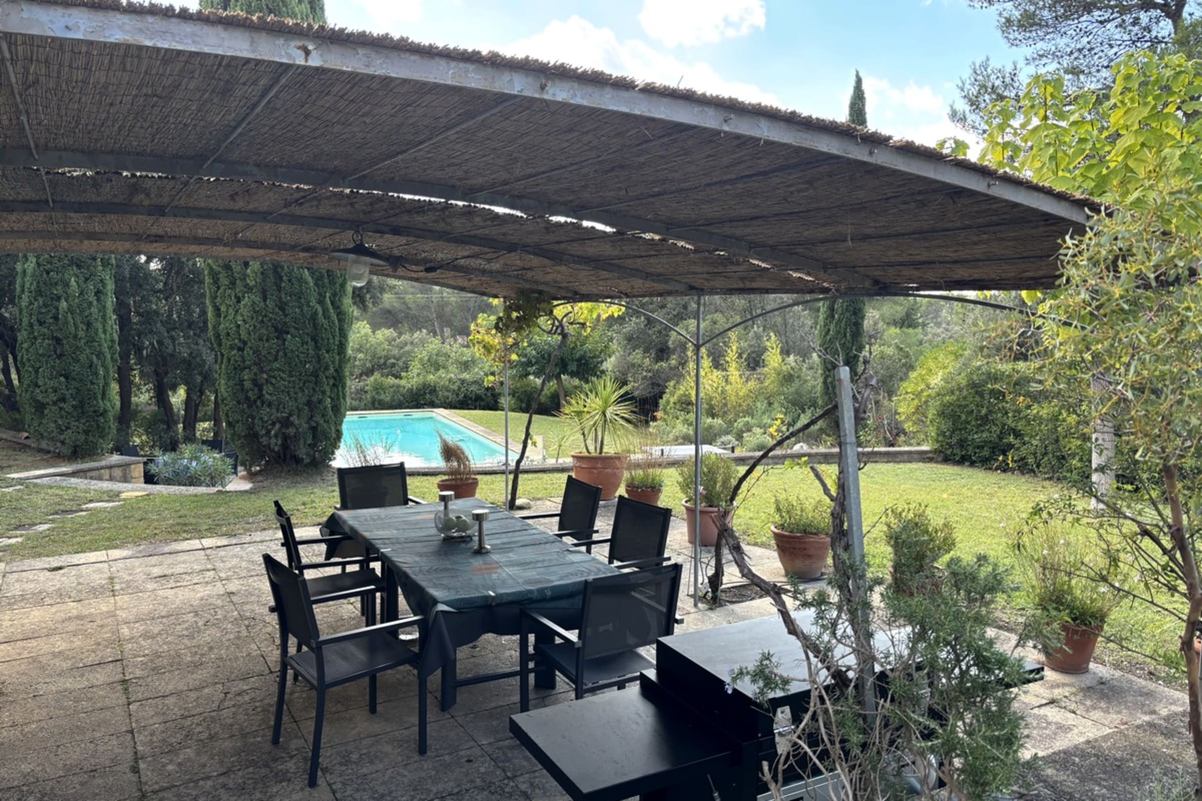 * Shaded terrace with large table and barbecue.