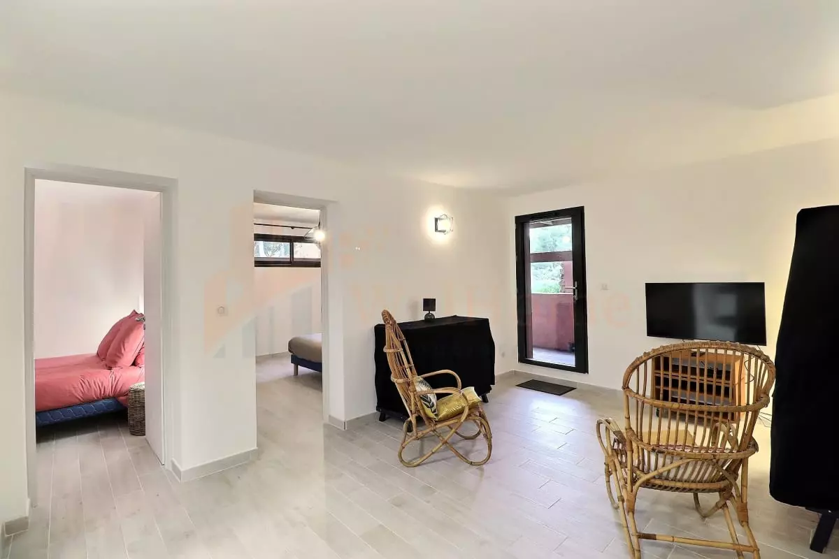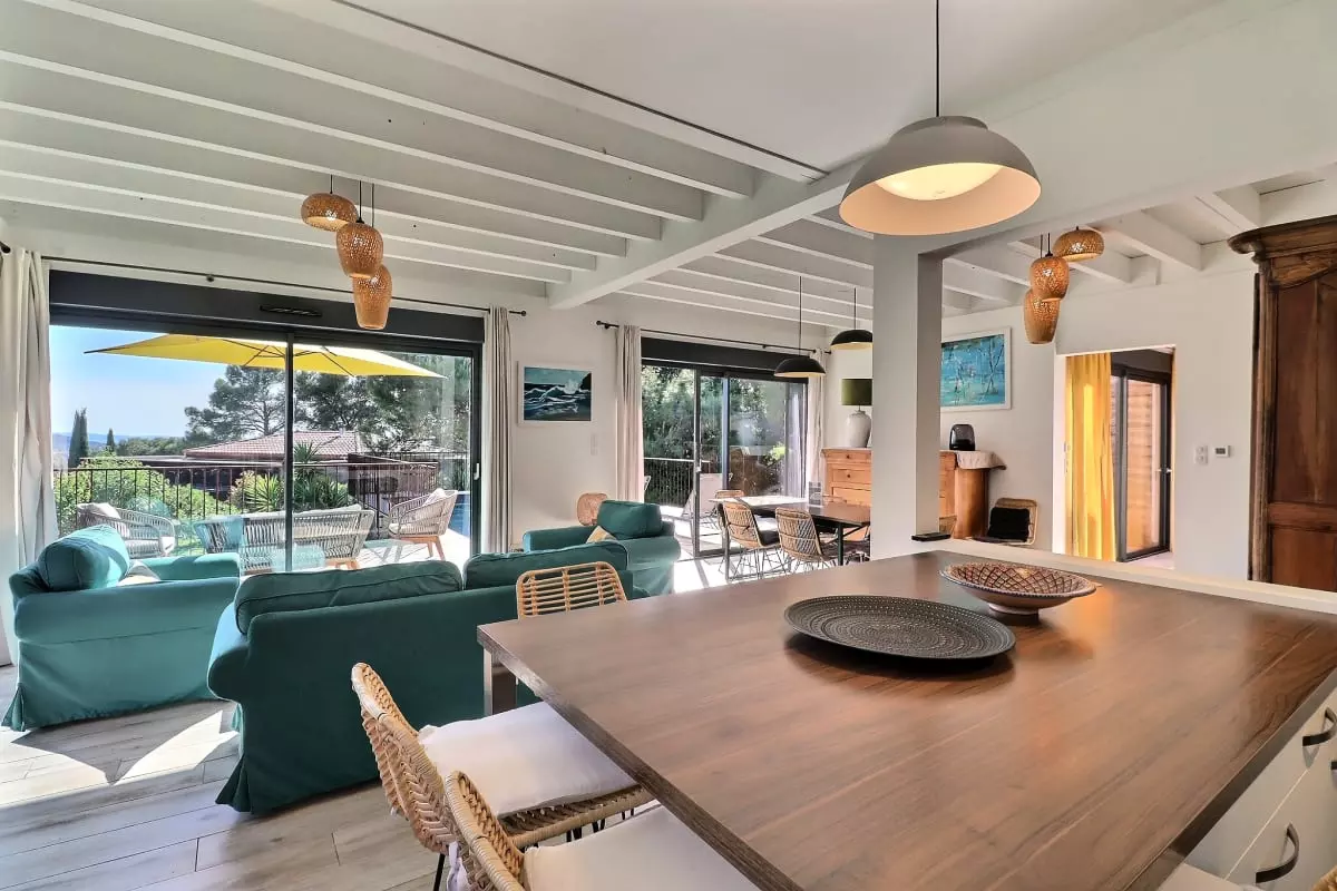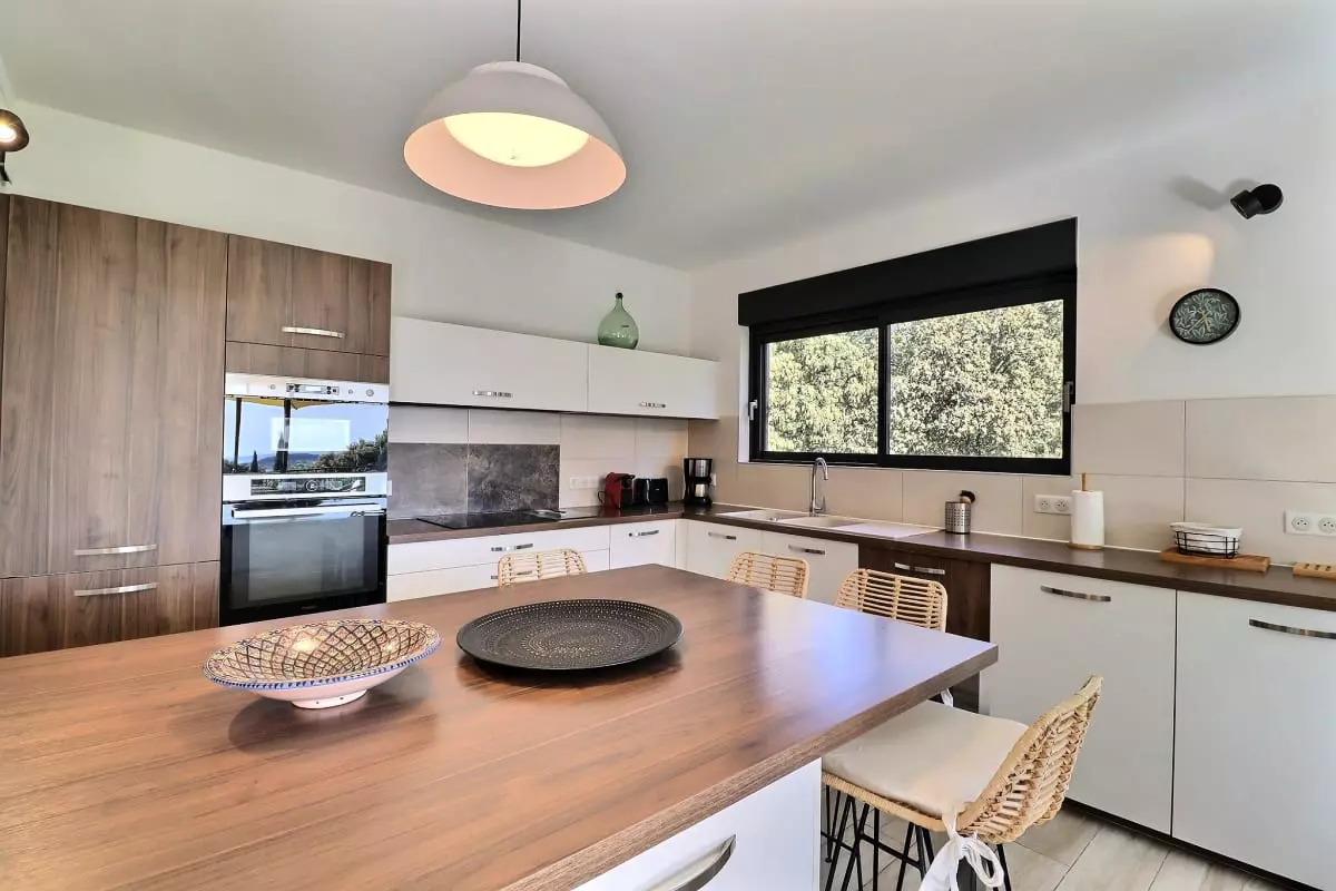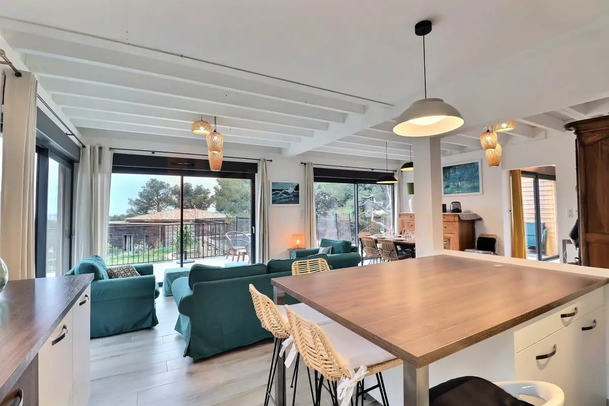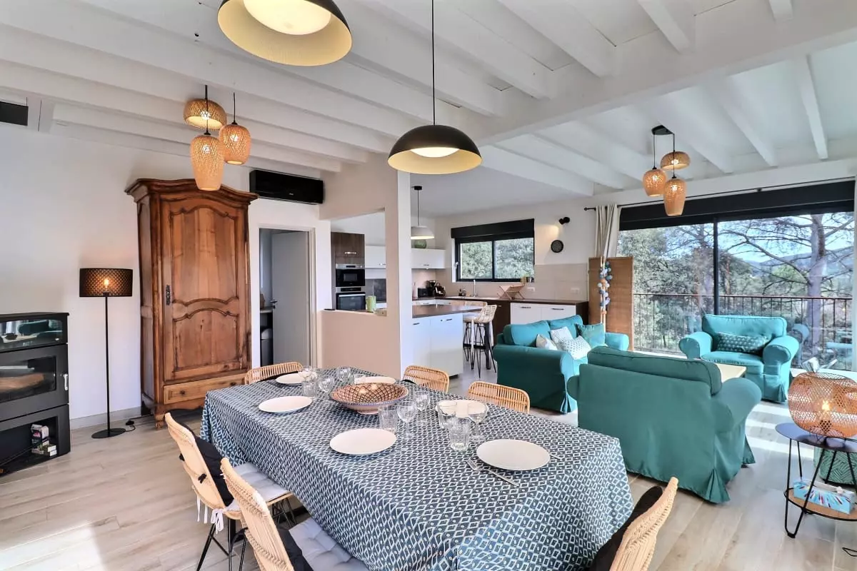 On the ground floor, you'll find a private entrance leading to a large, air-conditioned living room (since 2022) with direct access to the terrace. This room features a seating area with a sofa, a wood-burning stove, a living area with a large dining table, and a fully equipped open-plan kitchen with a central island and a high table. There's also a separate toilet.