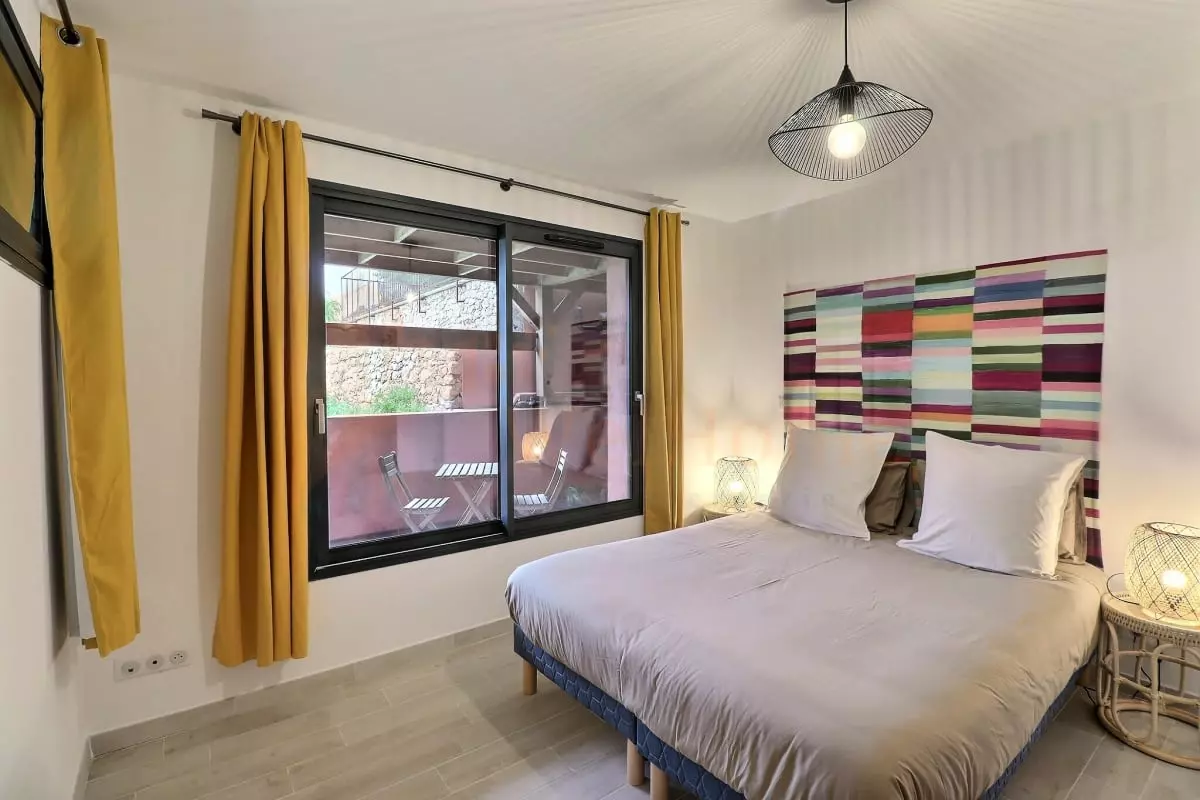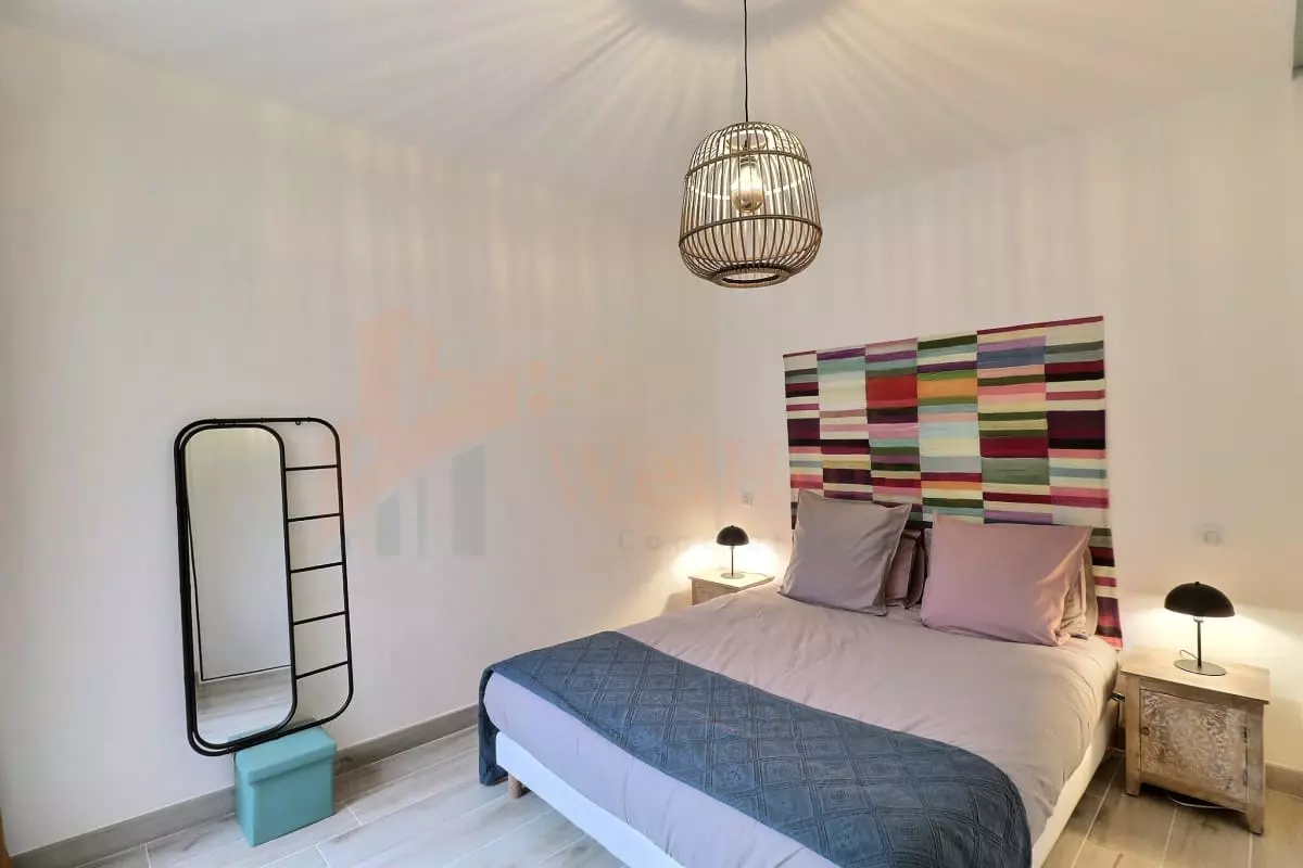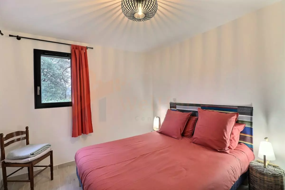 On the garden level, you will find two additional bedrooms, each with a 160 x 200 cm bed and a storage closet, fans, as well as another bathroom and an English courtyard.