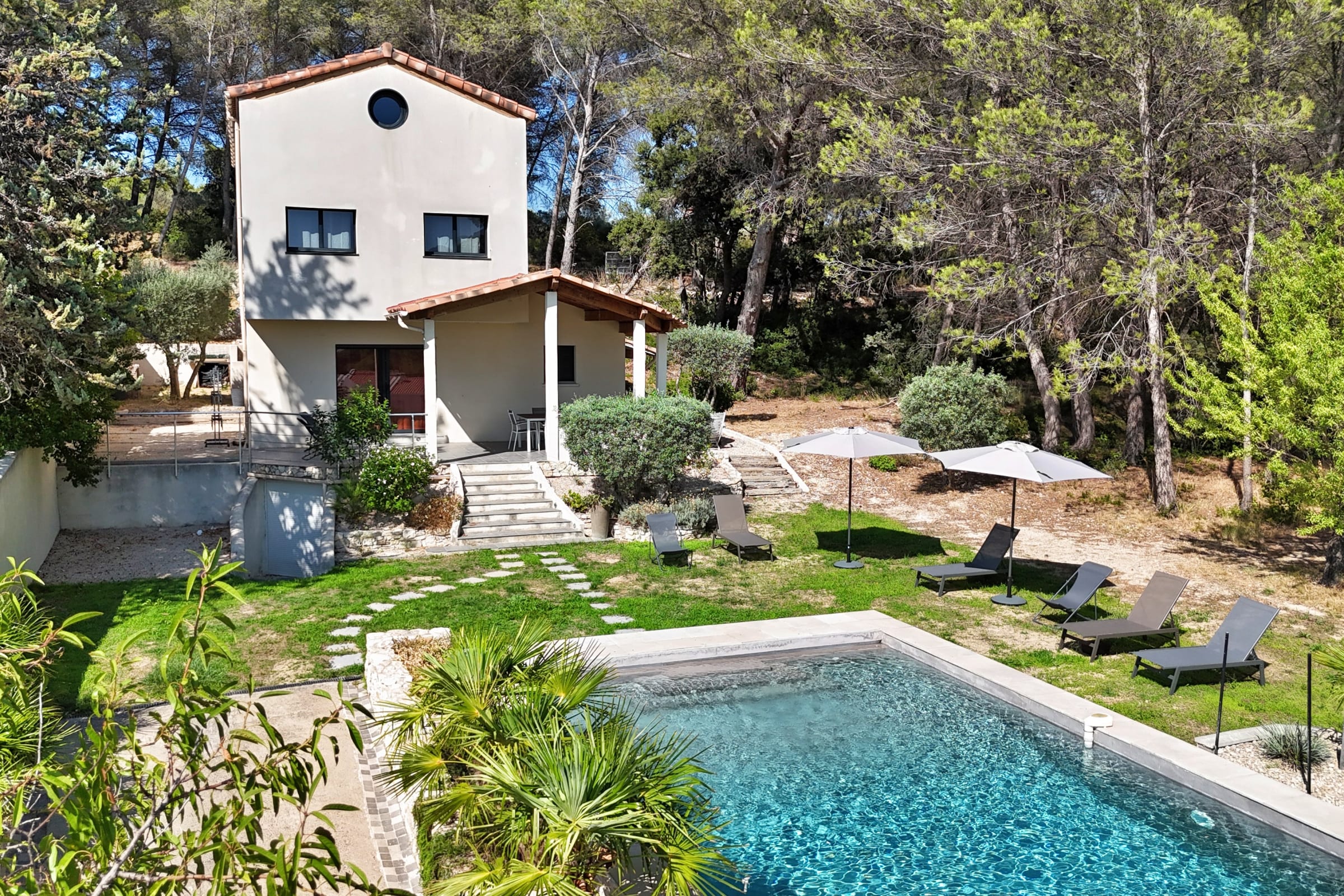 In the main house, the bright living room, fully equipped open-plan kitchen, and dining area come together to create a generous and welcoming living space, opening directly onto the landscaped garden and the infinity pool. The entire space enjoys abundant natural light thanks to large bay windows overlooking the outdoors.