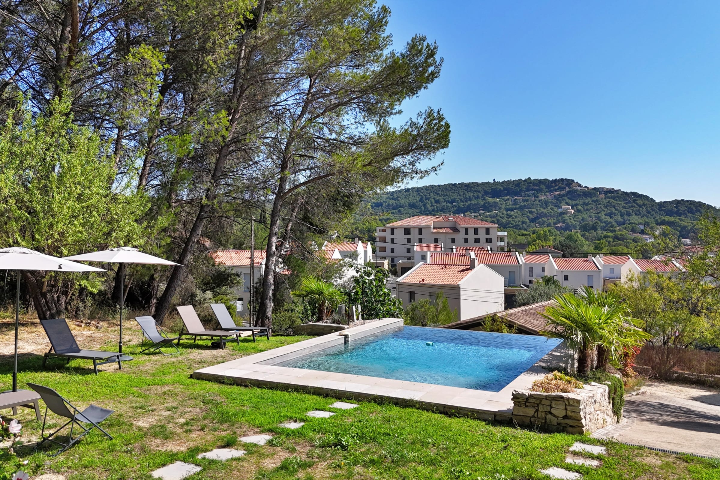 Access to the villa is via a sloping residential road, which offers an elevated view of the surrounding area. However, low-clearance vehicles are not recommended. A sn of local shops—including a bakery, butcher, and cafés—are within walking distance, while the historic village center of Ventabren is just a few minutes away by car.